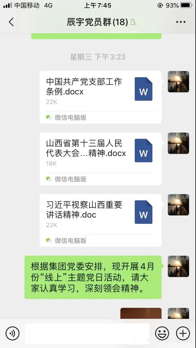 此次活動為線上學(xué)習(xí),黨支部統(tǒng)一將《中國共產(chǎn)黨支部工作條例(試行)》《山西省第十三屆人民代表大會第三次會議精神》等學(xué)習(xí)資料發(fā)送至QQ群,要求全體黨員和入黨積極分子認真學(xué)習(xí),深刻領(lǐng)會。通過此次主題黨日活動,大家紛紛表示要時刻用黨員標準嚴格要求自己,立足崗位、奮發(fā)有為,為更好地建設(shè)辰宇公司貢獻力量。