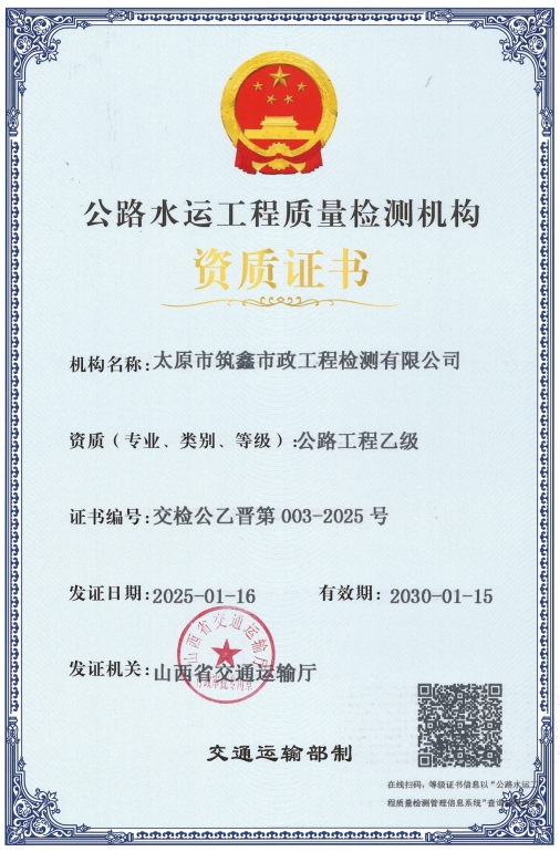 近日,筑鑫公司成功獲得公路水運(yùn)工程質(zhì)量檢測機(jī)構(gòu)“公路工程乙級”資質(zhì)證書。此次資質(zhì)升級,不僅是對筑鑫公司在公路工程檢測領(lǐng)域?qū)I(yè)實(shí)力的有力證明,更是其實(shí)現(xiàn)跨領(lǐng)域發(fā)展的重要里程碑,意味著下一步能夠?yàn)楣饭こ探ㄔO(shè)提供更多維度、更具專業(yè)性與精準(zhǔn)度的檢測服務(wù)。