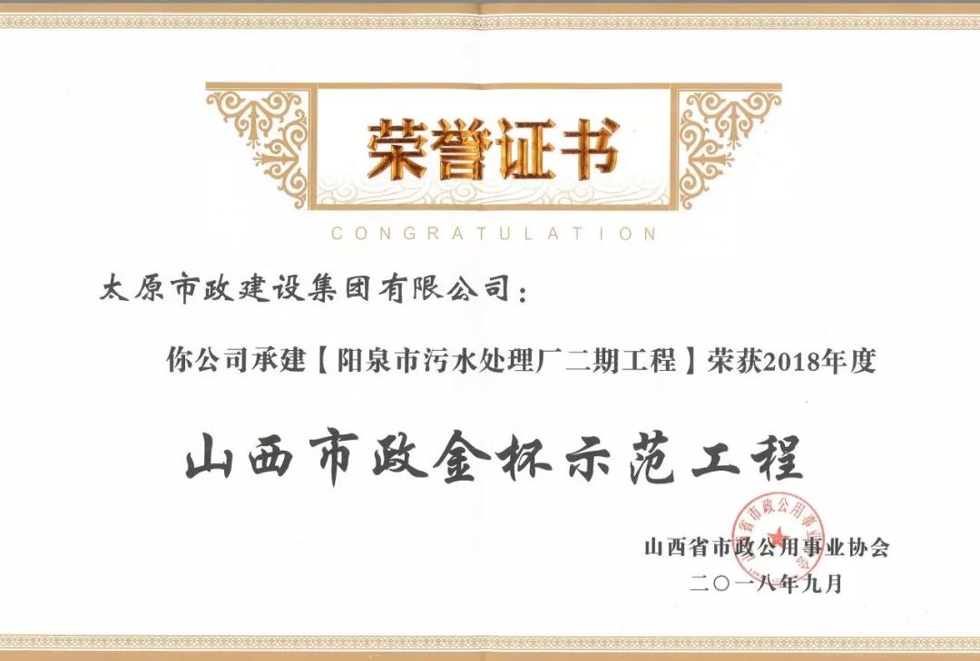9月20日,太原市政建設(shè)集團(tuán)有限公司承建的太茅路改造工程三標(biāo)段、陽(yáng)泉市污水處理廠二期工程、上莊街(西中環(huán)——少管所三岔口)道路改造工程、太茅路(康寧街——迎賓路)改造工程二標(biāo)段榮獲山西省市政公用事業(yè)協(xié)會(huì)頒發(fā)的2018年度“山西市政金杯示范工程”榮譽(yù)稱號(hào)。