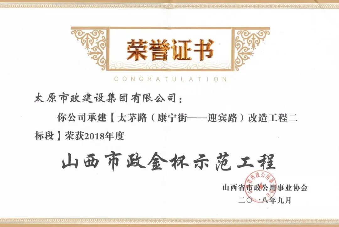 太原市政建設(shè)集團(tuán)有限公司多項(xiàng)工程喜獲山西省市政金杯示范工程榮譽(yù)稱號(hào)