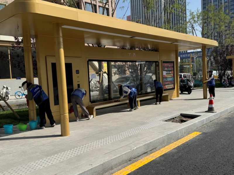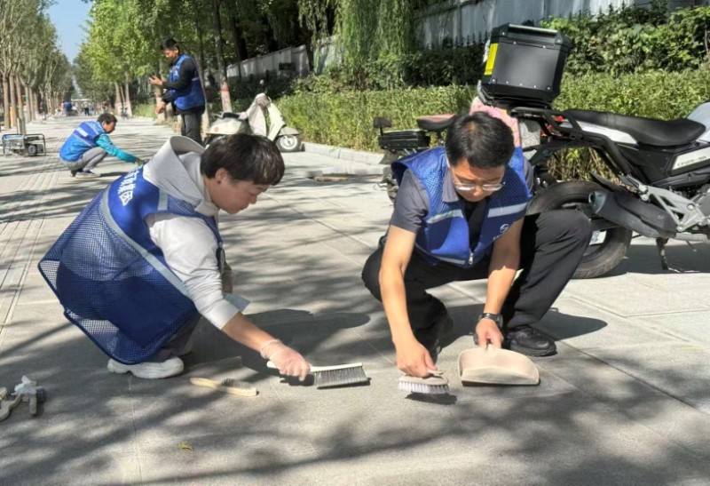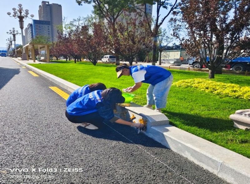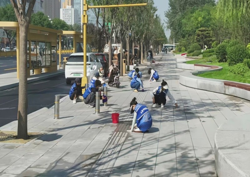 活動自9月4日起為期六天,覆蓋迎澤大街(西段)全線,重點圍繞附屬設(shè)施清潔與道路精細化維護展開?;顒又校碇y(tǒng)一藍色“太原市政集團”馬甲的志愿者們,手持長柄擦洗器、水桶、抹布、鏟刀、掃帚等工具,對道路兩側(cè)公交站臺、路燈基地、護欄、照明燈桿等設(shè)施進行系統(tǒng)清理與擦洗;同步推進地磚灌縫精細化維護作業(yè),通過專業(yè)操作,確保每一條裂縫都“嚴絲合縫”,有效提升路面耐用性與通行舒適度,以實際行動為市民出行安全與舒適保駕護航;同時,志愿者專門對道路沿線的石頭字景觀展開描金作業(yè),細刷蘸取金色涂料,一筆一畫精心描摹,成為主干道上一道兼具文化氣息與視覺美感的獨特風(fēng)景。