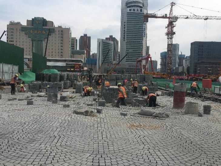 該工程包括七條道路及管網(wǎng)的施工建設(shè),其中涉及大量人工進(jìn)行花崗丁石的鋪裝任務(wù),項目部結(jié)合實際、統(tǒng)籌管理,將七條道路分為三個工區(qū),形成各條道路互不影響、全面鋪開的施工局面,各工區(qū)針對鋪裝關(guān)鍵點進(jìn)行隨時監(jiān)測,組織施工人員全天候盯守現(xiàn)場,及時監(jiān)測石材鋪裝過程,嚴(yán)格把控鋪裝紋路、石材縫隙、打磨程度等,確保鋪裝質(zhì)量達(dá)到規(guī)定要求。目前,該工程已進(jìn)入全路面鋪裝階段,平均每天有260多名民建隊人員參與石材鋪筑,項目部將整個隊伍按照花崗巖“切割、鋪裝、灌縫、打磨”的施工環(huán)節(jié)進(jìn)行分組,各組全面負(fù)責(zé)一道工序,極大提升工作積極性,形成相互促進(jìn)、互相學(xué)習(xí)的良好氛圍,并采用分段鋪裝打磨的方式,有效提高施工效率,保證施工進(jìn)展。