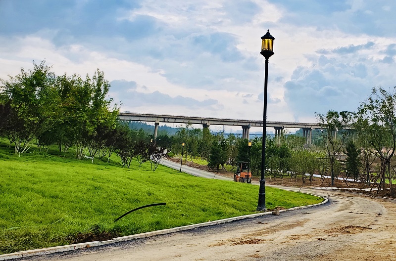 該工程屬于汾河四期治理美化工程的組成部分,要與園林、道路等同步施工,為呈現(xiàn)汾河美化整體效果,施工中時常出現(xiàn)設(shè)計變更情況,項目部結(jié)合施工實際,按照圖紙推進施工。在三標段施工中,設(shè)計要求將已做好燈基礎(chǔ)的草坪燈改為亮度更高、基礎(chǔ)更大的庭院燈,項目部組織施工人員在不破壞原有路燈基礎(chǔ)的情況下,再次擴建開挖新的路燈基礎(chǔ),并在搭建更多模具的基礎(chǔ)上,通過澆筑混凝土保持其安全與穩(wěn)固。同時,因部分路段要增加休息平臺,項目部將已做好的管線破除,重新設(shè)置休息平臺的末端管線接頭,并嚴格按照設(shè)計規(guī)劃,改為繞平臺一圈后再做管線與基礎(chǔ),以確保汾河景觀的整體呈現(xiàn)效果。