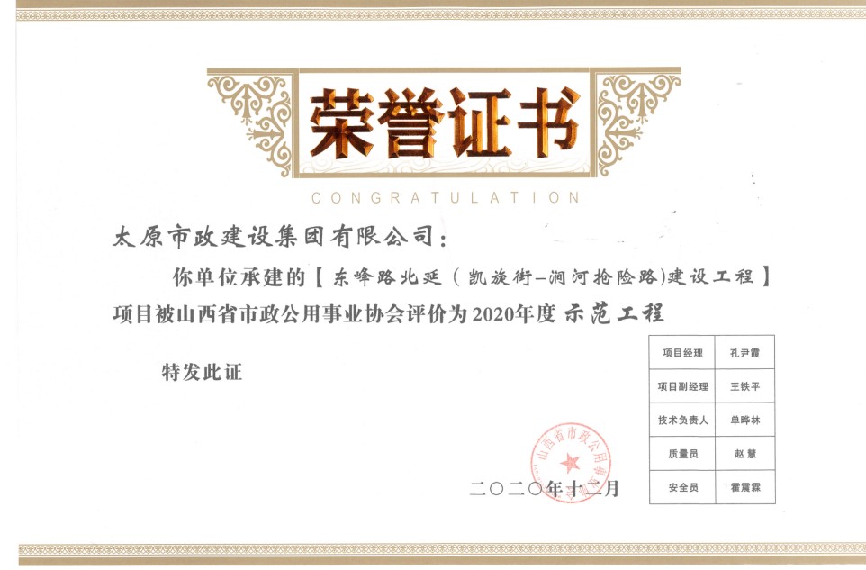 近日,集團(tuán)公司承建的塢城北街、軍民路改造工程被山西省市政公用事業(yè)協(xié)會(huì)評為“2020年度精品示范工程”,東峰路北延(凱旋街—澗河搶險(xiǎn)路)建設(shè)工程,賈家莊西路、健康西路建設(shè)工程被山西省市政公用事業(yè)協(xié)會(huì)評為“2020年度示范工程”。同時(shí),高鴻、孔尹霞在2020年度山西省市政公用事業(yè)協(xié)會(huì)市政工程項(xiàng)目經(jīng)理評價(jià)活動(dòng)中被評為“優(yōu)秀項(xiàng)目經(jīng)理”。