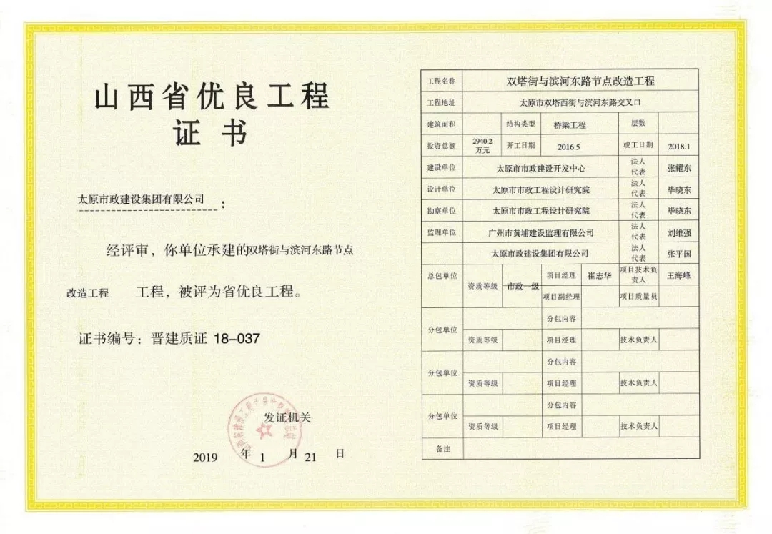 5月8日,太原市政建設集團有限公司第八工程公司承建的雙塔街與濱河東路節(jié)點改造工程榮獲“山西省優(yōu)良工程”榮譽稱號。