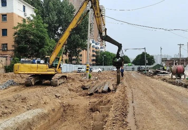 除迎新街北段外,其他道路在溝槽開挖時,都需要在施工過程中對老舊居民樓進行保護。項目部經過仔細研究后,決定在建筑物旁采用兩排高壓旋噴樁進行隔離保護,減少施工對老舊建筑物的影響,確保工程安全。面對地下管線復雜的情況,項目部積極聯系業(yè)主,多次與煤氣、自來水、供熱等公司溝通協(xié)調,最終對影響施工的管線進行改遷,為工程順利施工奠定了基礎。同時,迎新西一條施工范圍內有十余根高壓電線桿,緊鄰雨污水管,因電線桿短期內無法遷移,若進行溝槽開挖,存在極大安全隱患,為確保施工安全,項目部采用打鋼板樁的方式對電線桿進行保護,順利解決了施工難題。